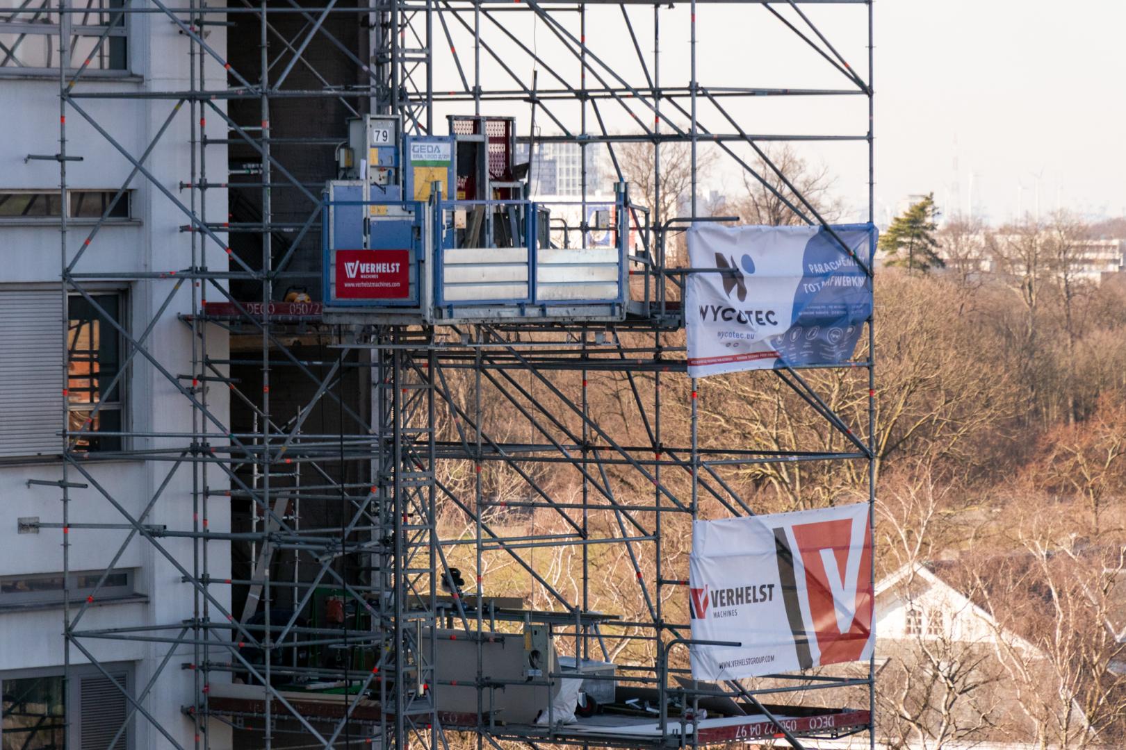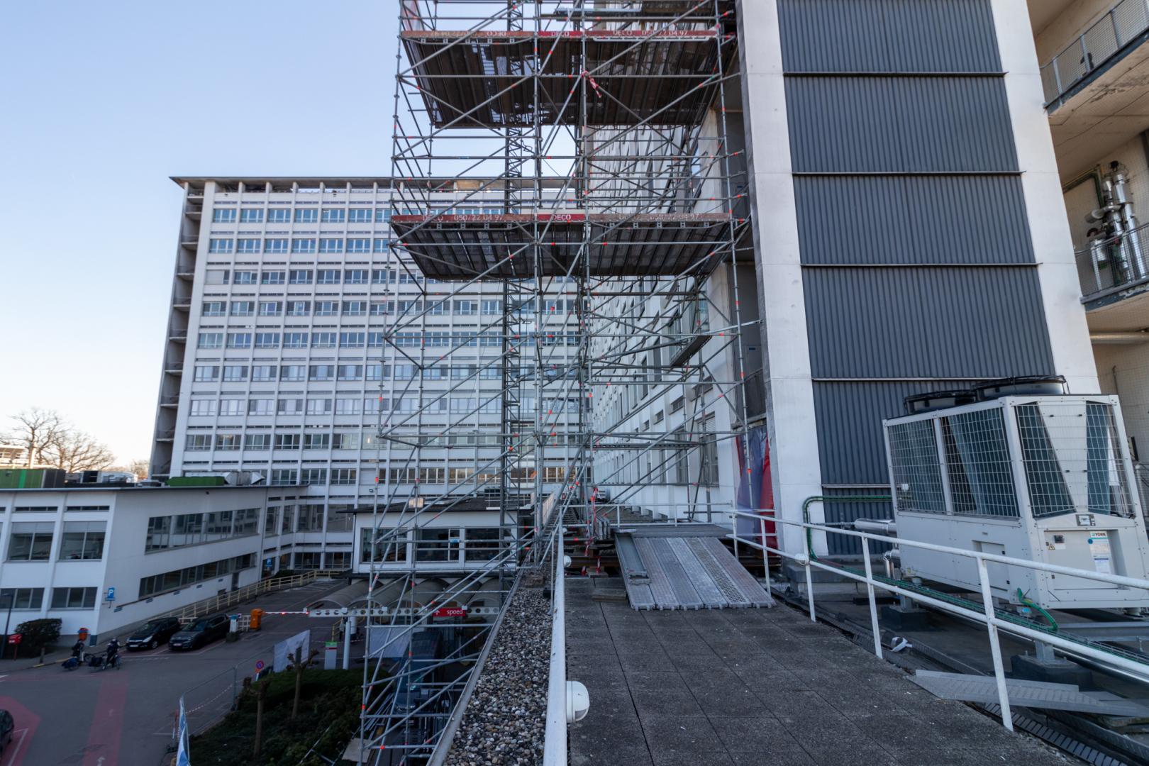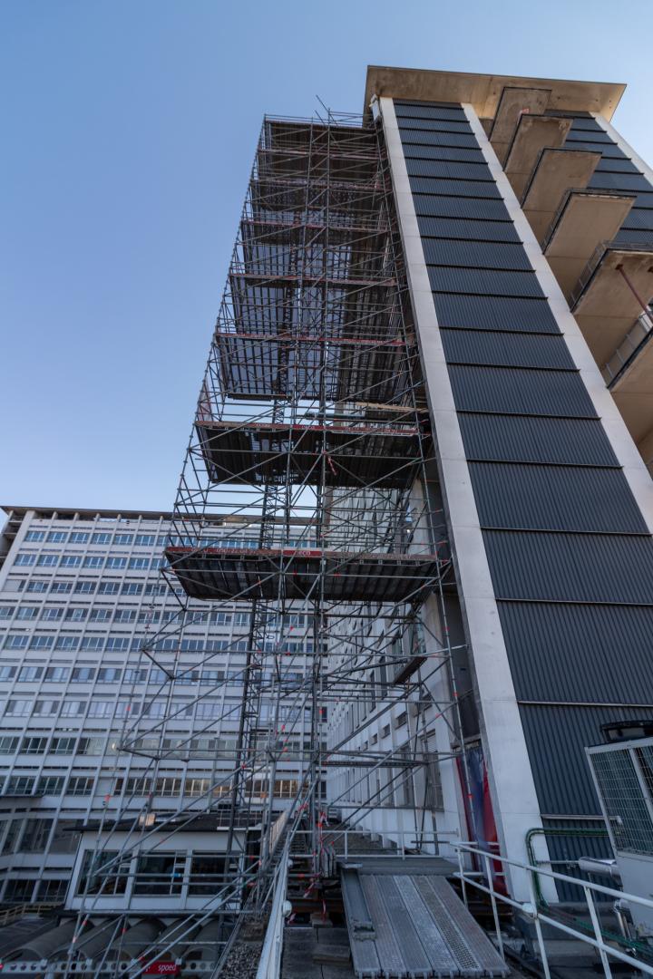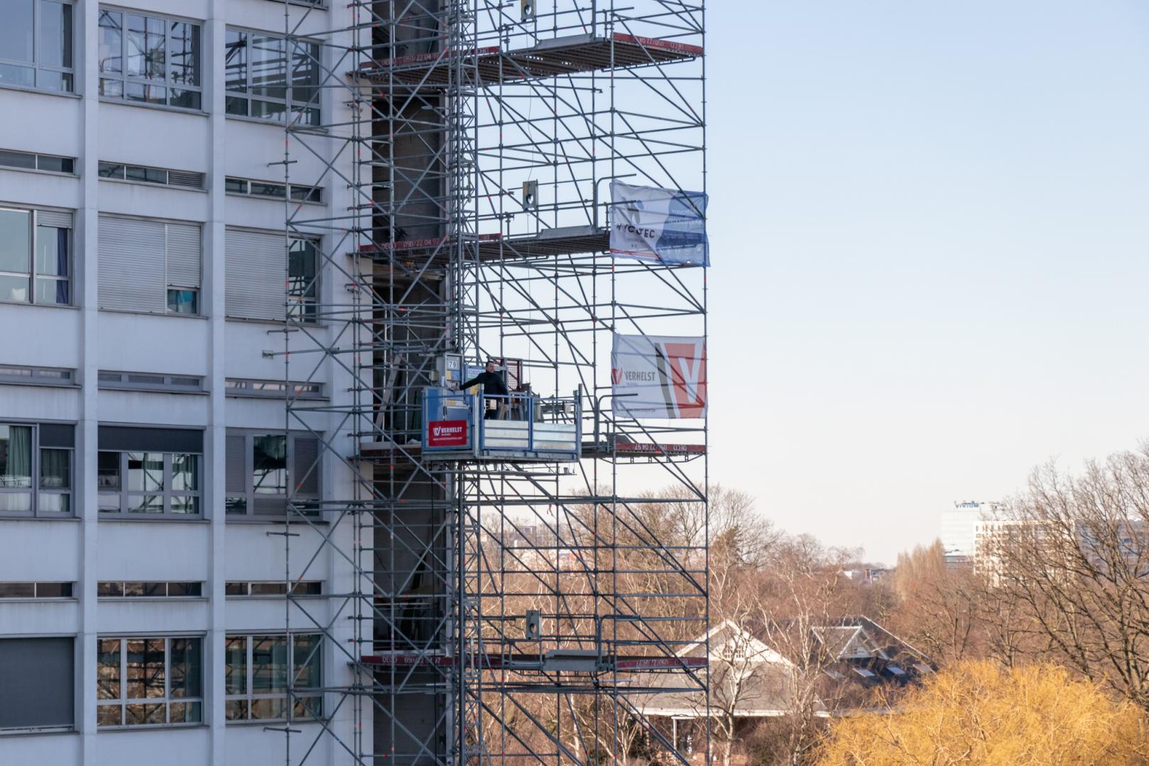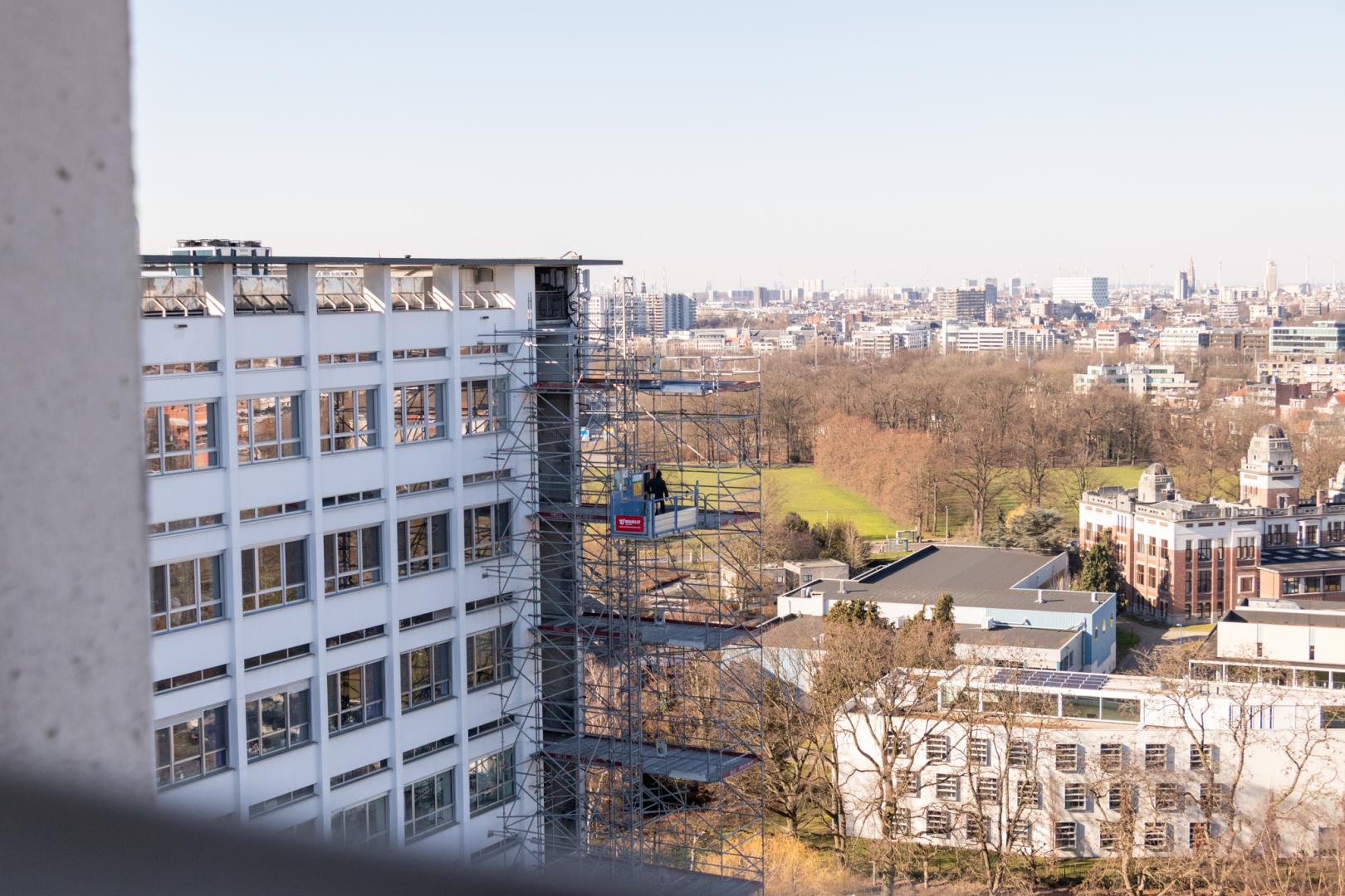 Notre client Wycotec travaille actuellement à la rénovation de la façade du ZNA Middelheim à Anvers et Verhelst Machines offre le soutien nécessaire. Pour un transport vertical aisé, un monte-charge de chantier Geda 1200 Z/ZP a été loué. Cependant, la tâche n’était pas simple, car la façade ne s'élève pas à la verticale.