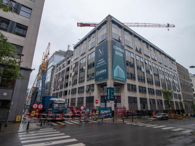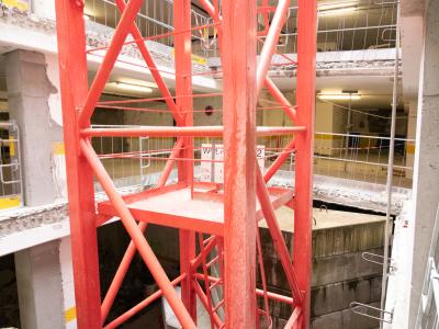 L'installation de la grue n'a pas été sans défis. Pour placer la grue, Verhelst Machines a dû faire passer le châssis par une ouverture étroite et l'installer ensuite dans le parking souterrain au niveau -5. Une fois le châssis en place, des extensions ont été ajoutées pour passer de 6 à 8 mètres afin de fournir suffisamment de stabilité. Nous avons réussi à terminer le travail à temps grâce à l'expertise et l'expérience étendues de nos monteurs. Installer une grue au centre de Bruxelles n'est jamais simple, en raison de l'espace limité et des permis restreints qui sont accordés seulement le week-end.