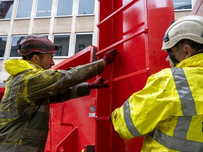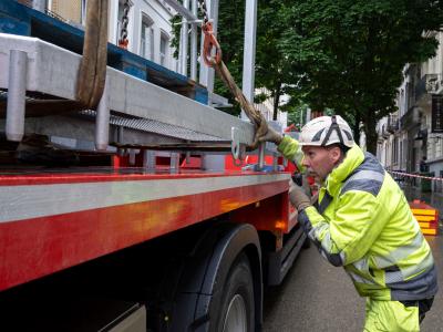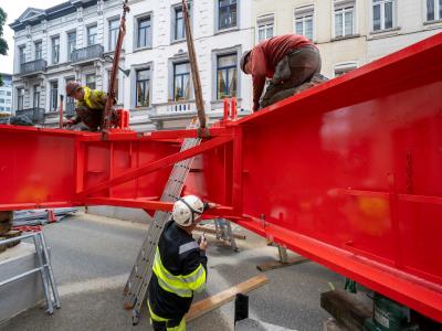 De Pascalestraat heeft een hellingspercentage van meer dan 5 procent, wat aanzienlijke uitdagingen met zich meebrengt. Om het portaal te bevestigen, werden betonblokken in de straat gegoten en daarop werd dan het portaal gemonteerd. Daarnaast staan er grote bomen in de straat en is de straat vrij smal, wat zorgt voor een beperkte bewegingsruimte voor onze telescoopkranen. Maar door ons vakmanschap en ervaring zijn we er toch in geslaagd om de montage vlot te laten verlopen.